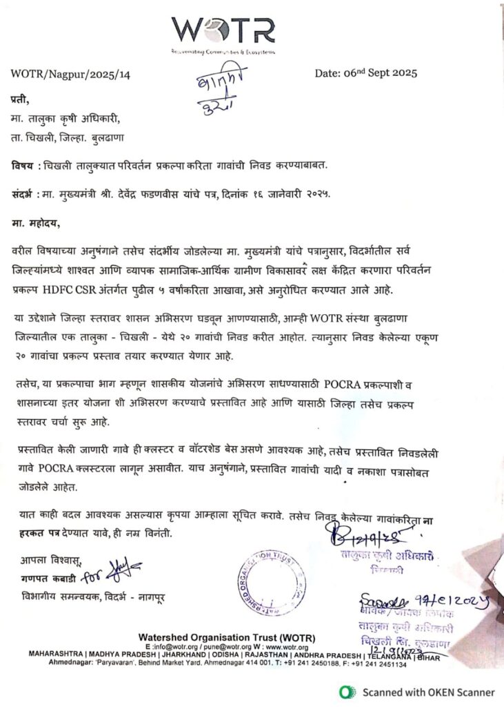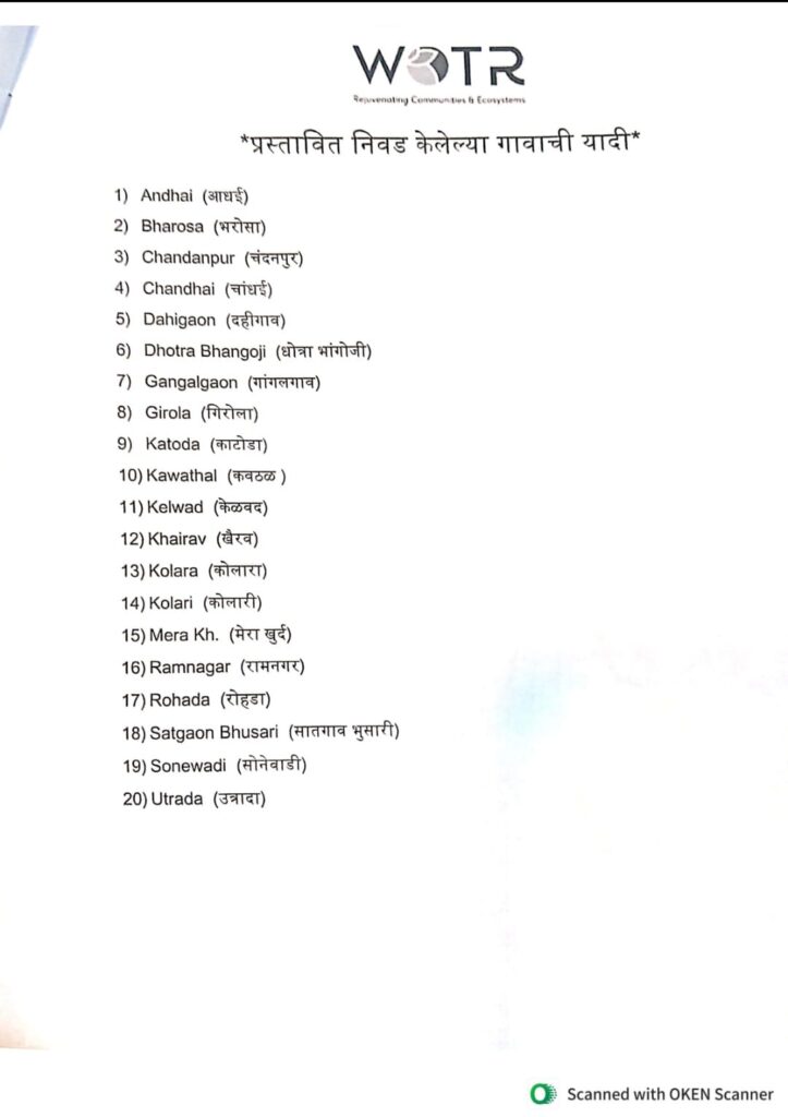 ही गावे एचडीएफसी CSR (HDFC CSR) कडून निवडण्यात आली असून, या गावांमध्ये WOTR संस्था जिल्हा प्रशासनाच्या मदतीने ग्रामविकास आराखडे (GPDP) तयार करणार आहे. या आराखड्यांत POCRA योजनेसह शासनाच्या इतर महत्वाच्या योजनांचे समन्वयाने अंमलबजावणी होणार आहे.