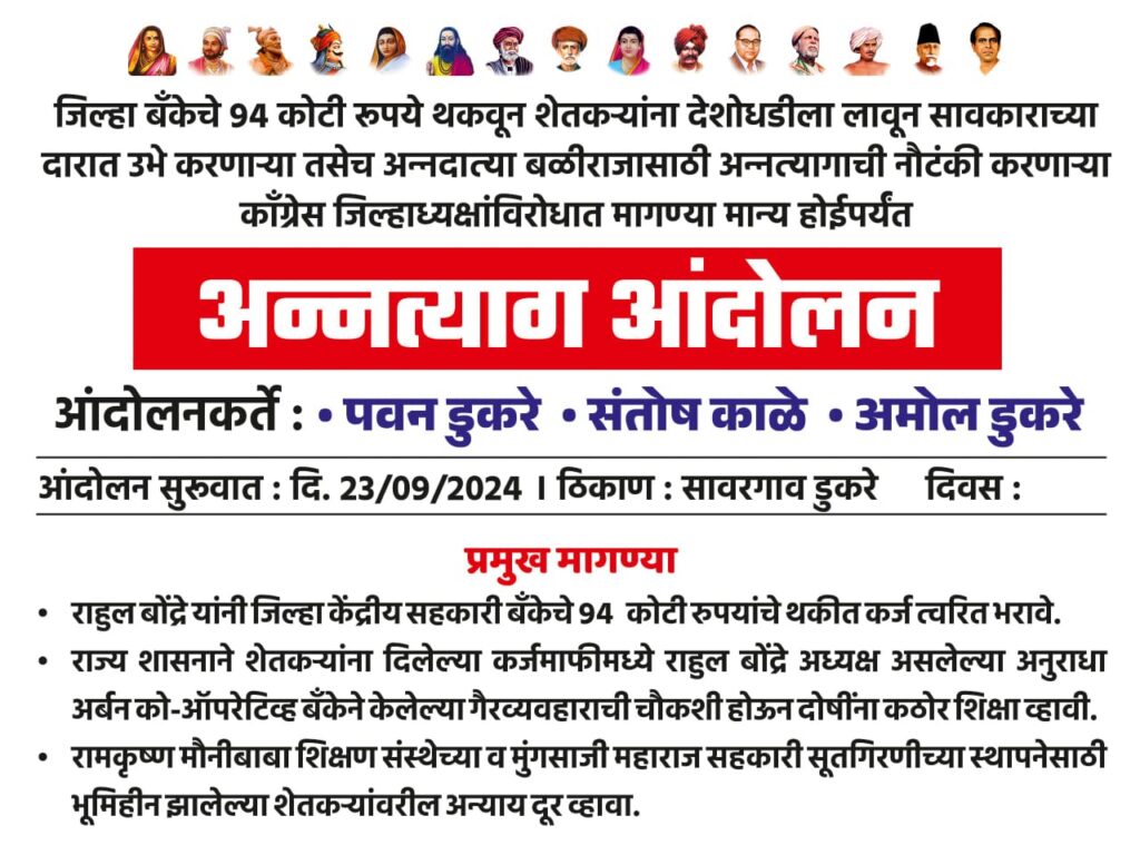 आपल्या निवेदनामध्ये भाजपा युवा मोर्च्याचे चिखली तालुकाध्यक्ष संतोष काळे म्हणाले की,जिल्हा बँकेचे 94 कोटी रुपये थकवुन शेतकऱ्यांना देशोधडीला लावून, सावकाराच्या दारात उभे करणाऱ्या, तसेच अन्नदात्या बळीराजासाठी अन्नत्यागाची नौटंकी करणारे काँग्रेस जिल्हाध्यक्ष यांच्या विरोधात आपल्या मागण्या मान्य होईपर्यंत, पवन डुकरे, संतोष काळे व अमोल डुकरे पाटील हे सावरगाव डुकरे येथेच आजपासून “प्रती अन्नत्याग” आंदोलन करणार आहेत.त्यांनी त्यांच्या मागण्या खालील प्रमाणे सांगितल्या आहेत.