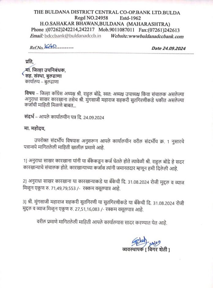 बुलढाणा दर्पणने राहुल बोंद्रे हे, अध्यक्ष किंवा संचालक असलेल्या संस्थाकडे असलेल्या कर्जाची माहिती जिल्हा उपनिबंधक कार्यालयाकडे मागितलेली होती. जिल्हा उपनिबंधक कार्यालयाने जिल्हा केंद्रीय सहकारी बँक बुलढाणा यांच्याकडे ती माहिती मागितली. सदर माहितीनुसार देण्यात आलेला 94 कोटी हा आकडा चुकीचा आहे , तर 31 ऑगस्ट 2024 पर्यंत राहुल बोंद्रे संचालक किंवा अध्यक्ष असलेल्या संस्थाकडे कर्जाची रक्कम 99 कोटी पेक्षा जास्त असल्याचे दिसून येत आहे.बुलढाणा दर्पण आपल्या वाचकांसाठी जिल्हा केंद्रीय सहकारी बँकेने प्रसारित केलेले पत्रच या बातमीसोबत जोडत आहे.